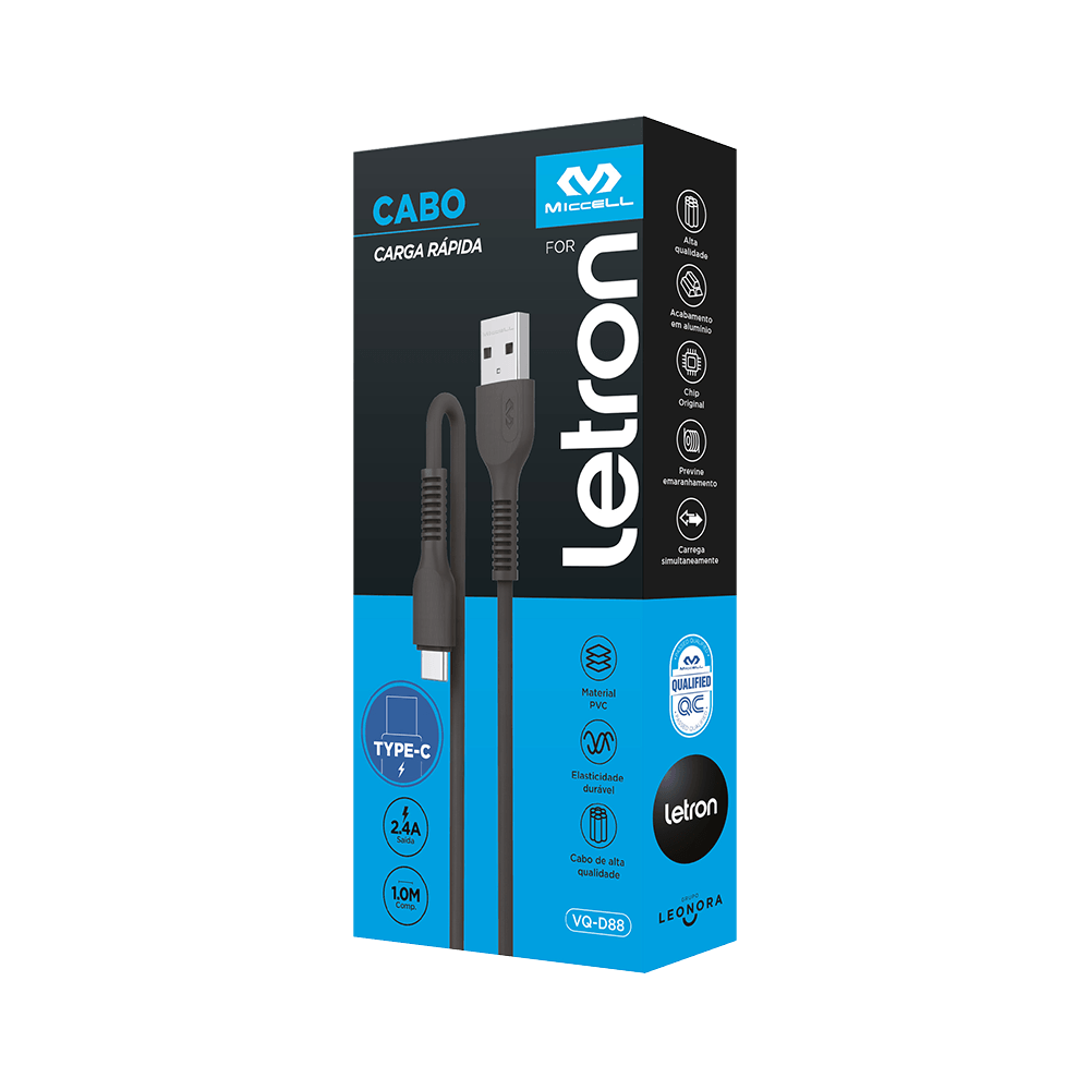CABO USB TIPO C PRETO 1M PVC - VQ-D88 - LETRON